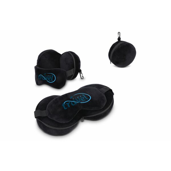 This travel pillow & eye mask combines a contoured pillow with an integrated eyemask for added comfort during rest and travel. The design folds into itself and features a zippered closure for compact storage and easy transport. A practical solution for use on planes, trains, and long journeys.