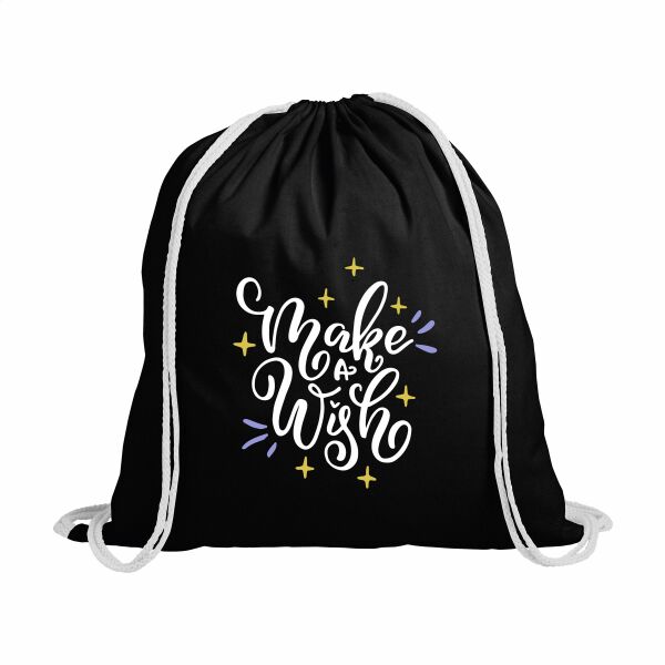 Rugzak van 100% katoen (120 g/m²). Met aanrijgkoorden. Inhoud ca. 8 liter.